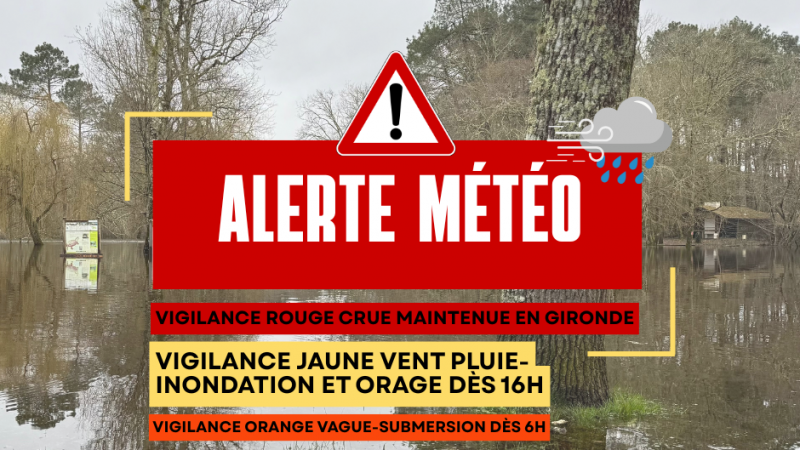 ⚠️ 🌧️ Le département de la Gironde reste placé en vigilance ROUGE crues et passe en vigilance JAUNE pour risque de vent, pluie-inondation et orage à compter de 16h00 et jusqu’à demain 21h00, puis en vigilance ORANGE vagues et submersion dès 6h demain, en prévision de la tempête Pedro 🔴🟡💨 ➡️ Rafales attendues ce soir : 90 à 110 km/h dans les terres ☁🌧️ Pluie prévue à partir de 16h, avec 20 à 30 mm attendus jusqu'à demain et pluie résiduelle ce vendredi 🌤️ Retour d'un temps relativement sec ce week-end 🚧❌ ATTENTION FERMETURE : le parc Birabeille sera donc fermé auj [...]
