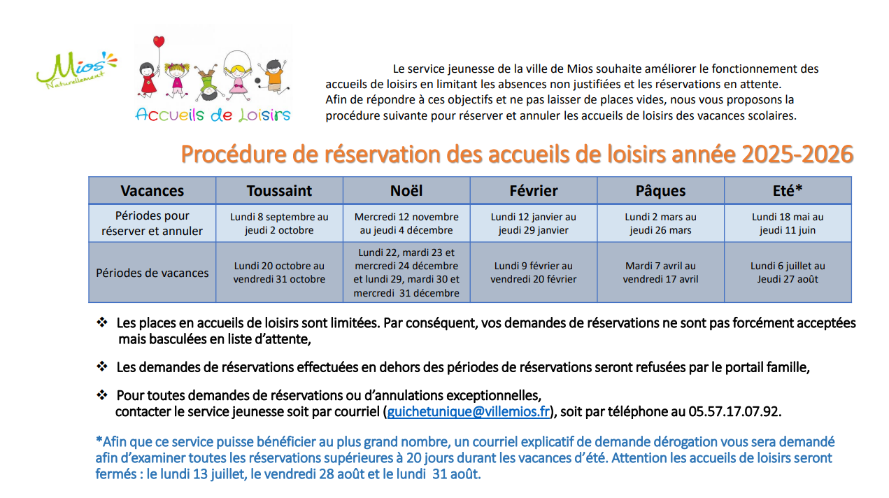 Accueils de Loisirs Sans Hébergement appelés couramment « ALSH » sont assurés par le service jeunesse de la Ville de Mios.