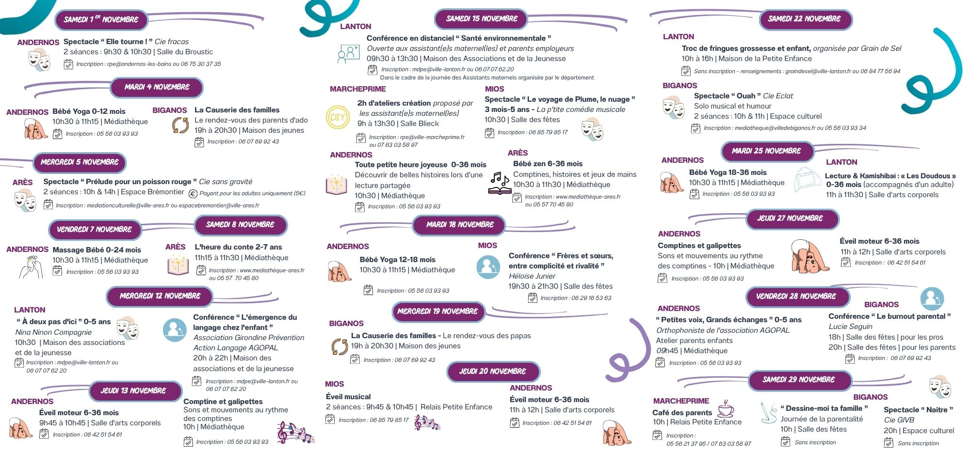 Le Relais petite enfance de Mios (Rpe Mios) vous a concocté un beau programme du 14 au 20 novembre octobre sur la Ville avec des animations, des ateliers, une exposition et un spectacle pour les familles le mercredi matin. 🎨🎶🗣
