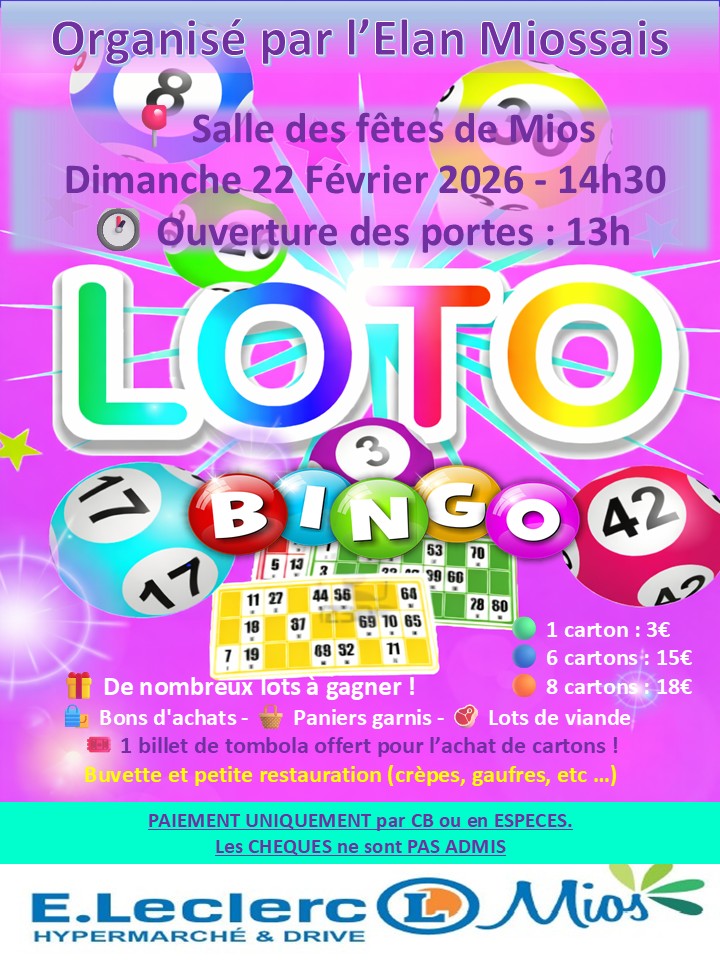 Rendez-vous dimanche 22 février à partir de 14h30 à la salle des fêtes de Mios, et tentez votre chance pour gagner de nombreux lots (bons d’achats, paniers garnis, lots de viande…) ! 🤞✨