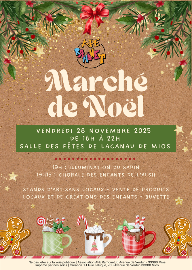 🎅 L’ APE Ramonet organise son Marché de Noël à la salle des Fêtes de Lacanau de Mios Vendredi 28 novembre de 16h à 22h ! 🎄