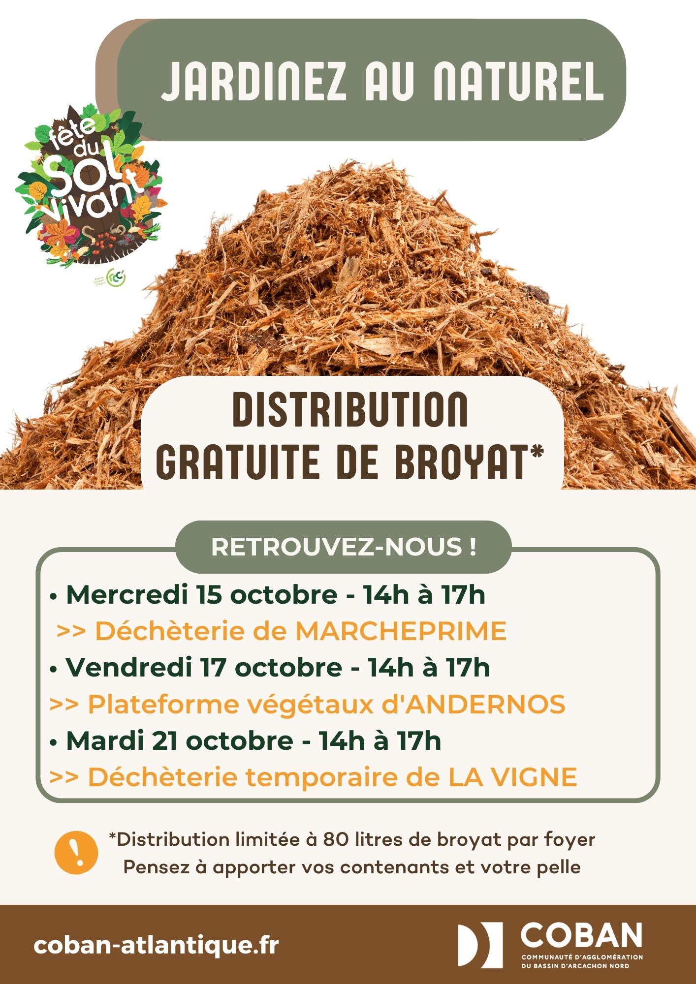 Dans le cadre de la 3e édition de la Fête du sol vivant du 11 au 26 octobre 2025, la COBAN vous propose une distribution gratuite de BROYAT sur 3 dates & 3 villes du Nord Bassin :